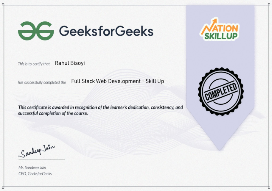 Successfully completed the Full Stack Web Development program covering frontend technologies, backend fundamentals, and real-world project implementation.